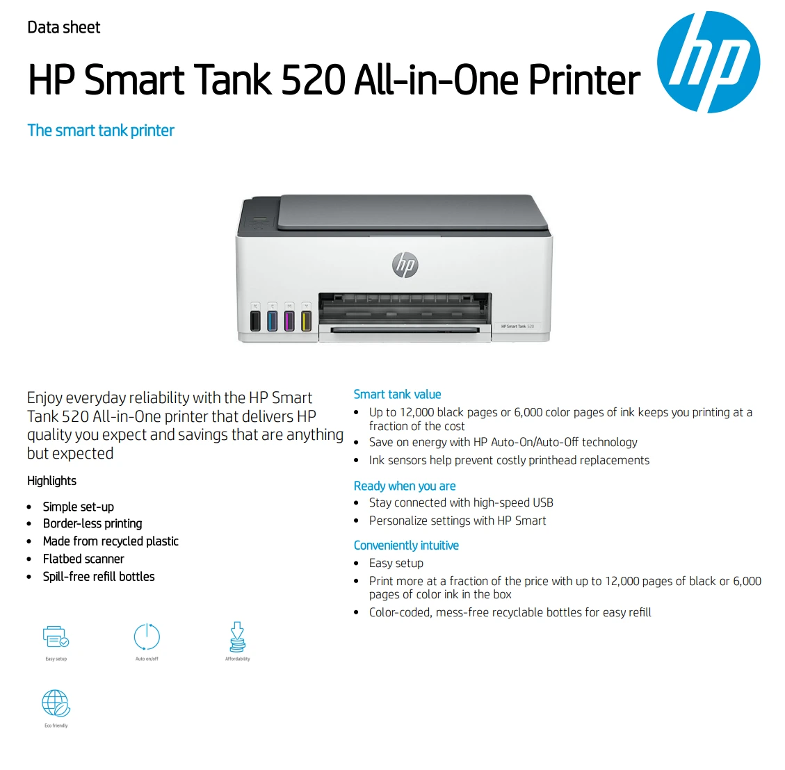 Specifications for – HP Smart Tank 520 Wireless All In One Printer, Print, Scan, Copy, Print up to 18000 black or 6000 color pages - Gray [1F3W2A]