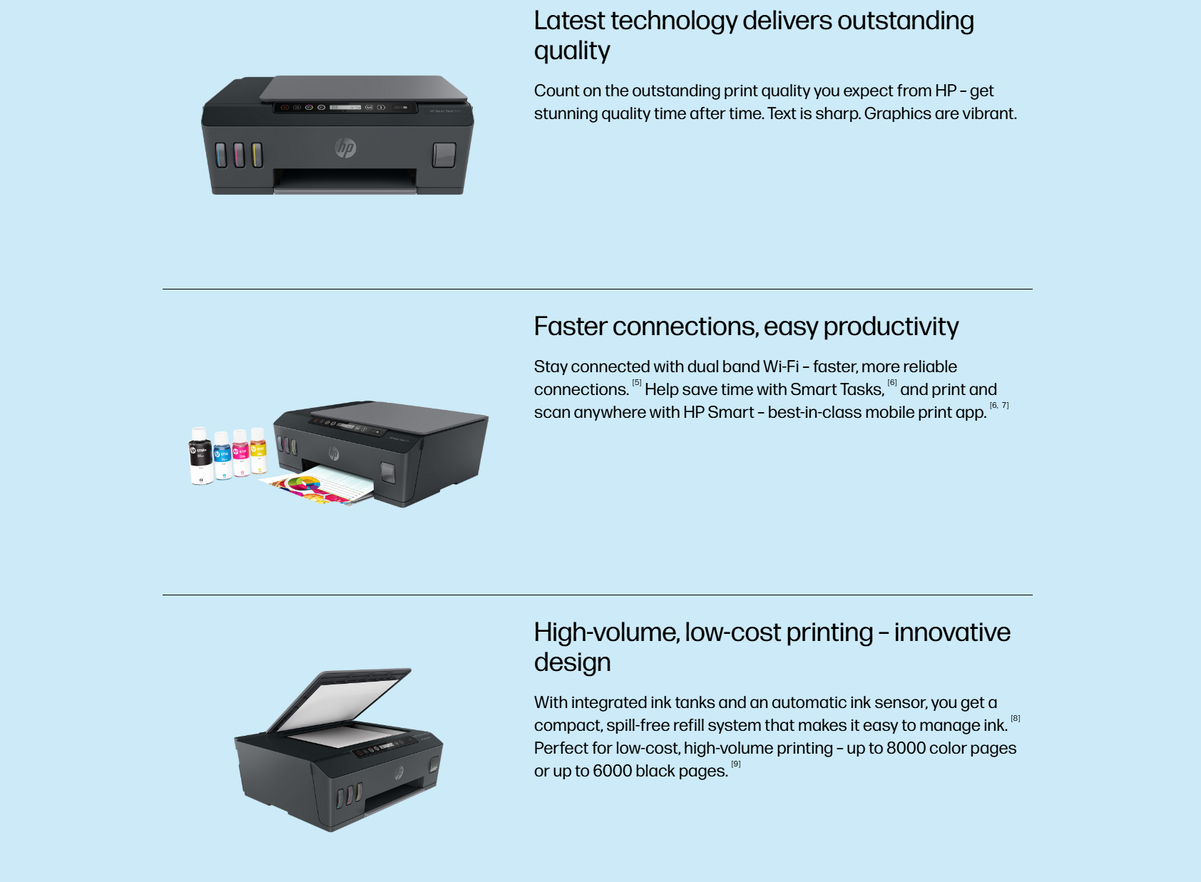 • HP Smart Tank 515 is a wireless all-in-one printer offering print, scan, and copy functions with high-quality output. It supports mobile printing, manual duplex, and various paper types and sizes, making it ideal for home and small office use.