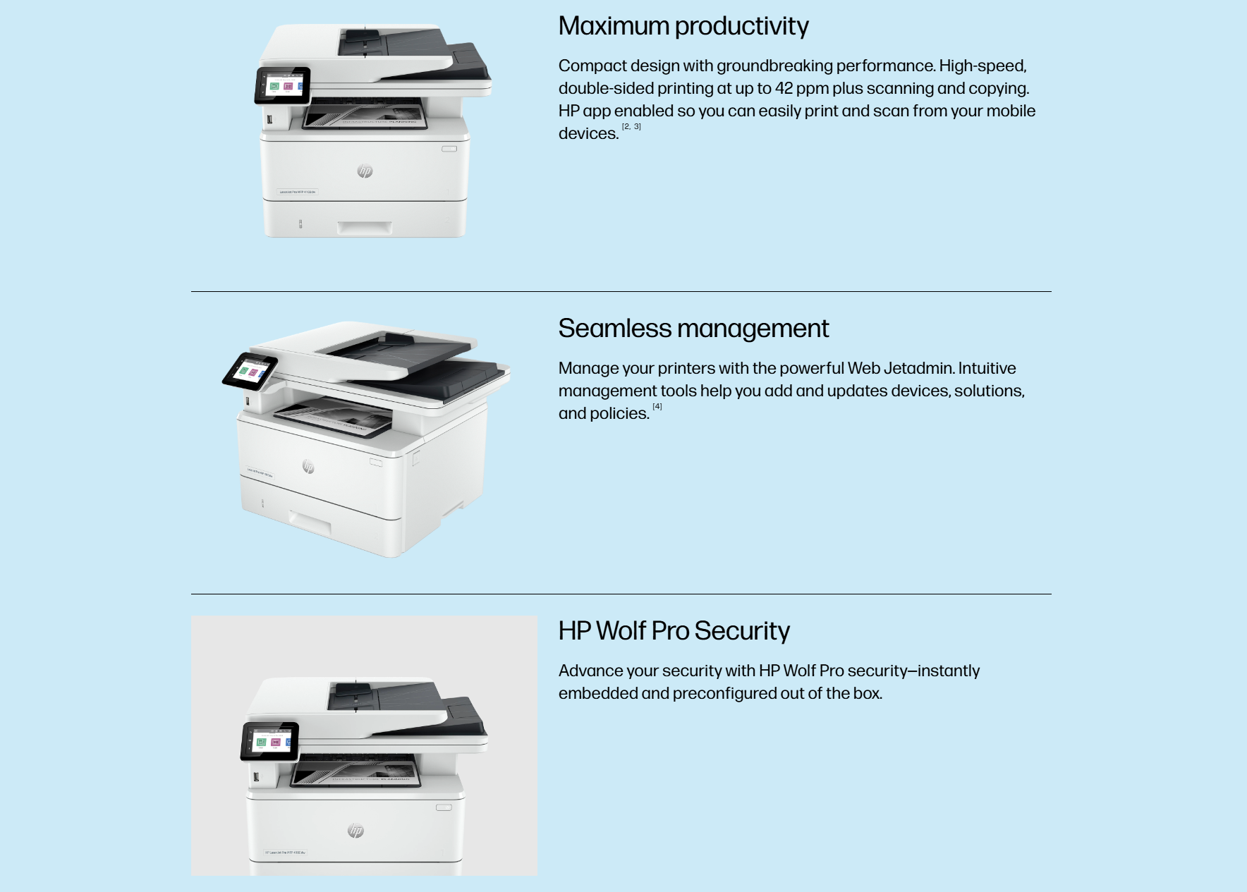 | Security | HP Security Manager, Optional Smart Security, HP Secure Print and Insights |