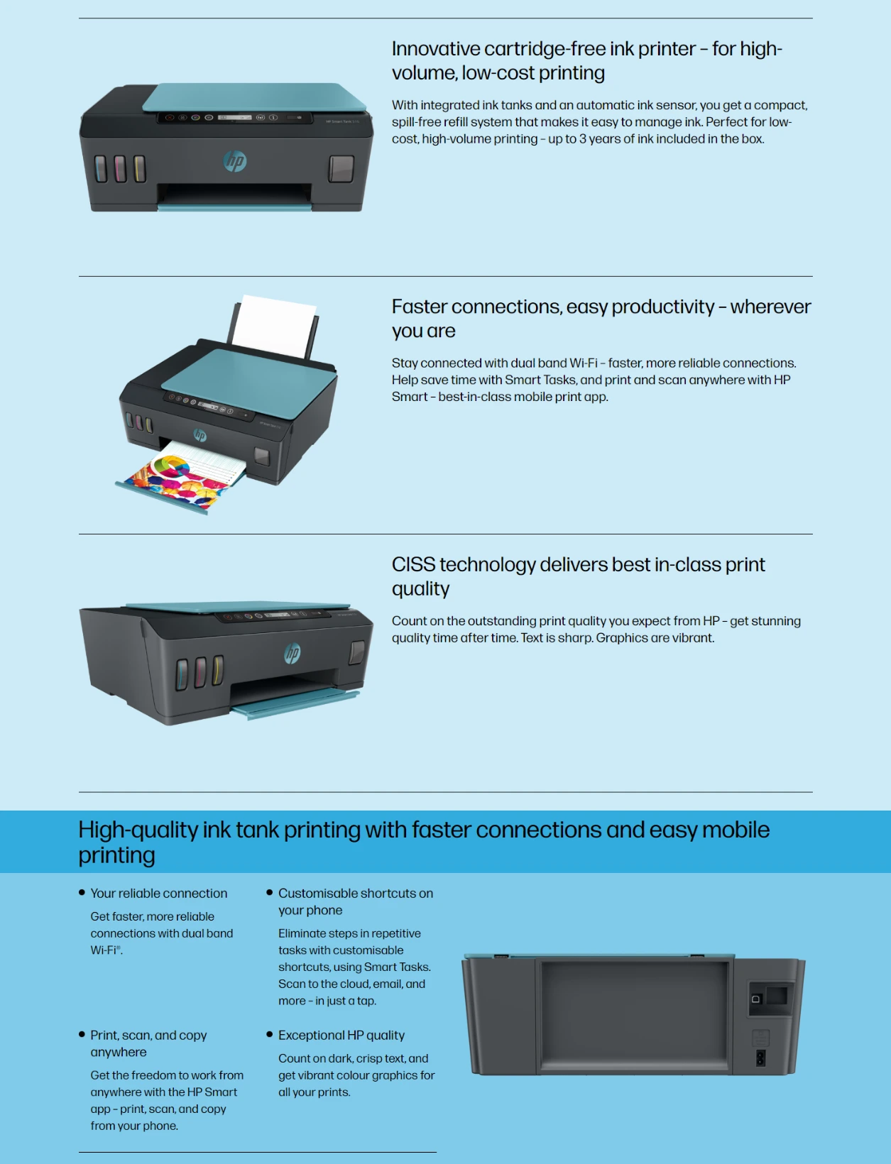 This high-capacity ink tank printer delivers uncompromising quality and up to 3 years of ink included in the box. Get faster connections with dual-band Wi-Fi, and easy mobile printing with HP Smart app.