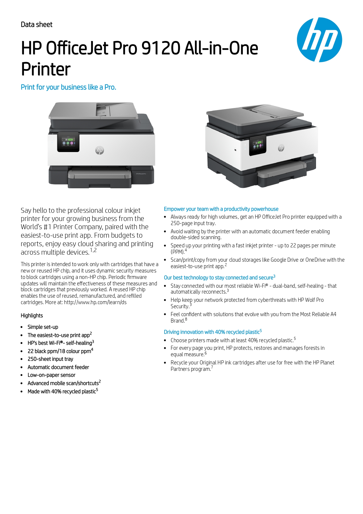 The HP OfficeJet Pro 9123 is a wireless all-in-one printer designed for small offices and home businesses. It supports print, scan, copy, and fax functions, with an automatic document feeder, two-sided printing and scanning, scan-to-PDF/email, and an easy-to-use touchscreen for efficient daily workflows.