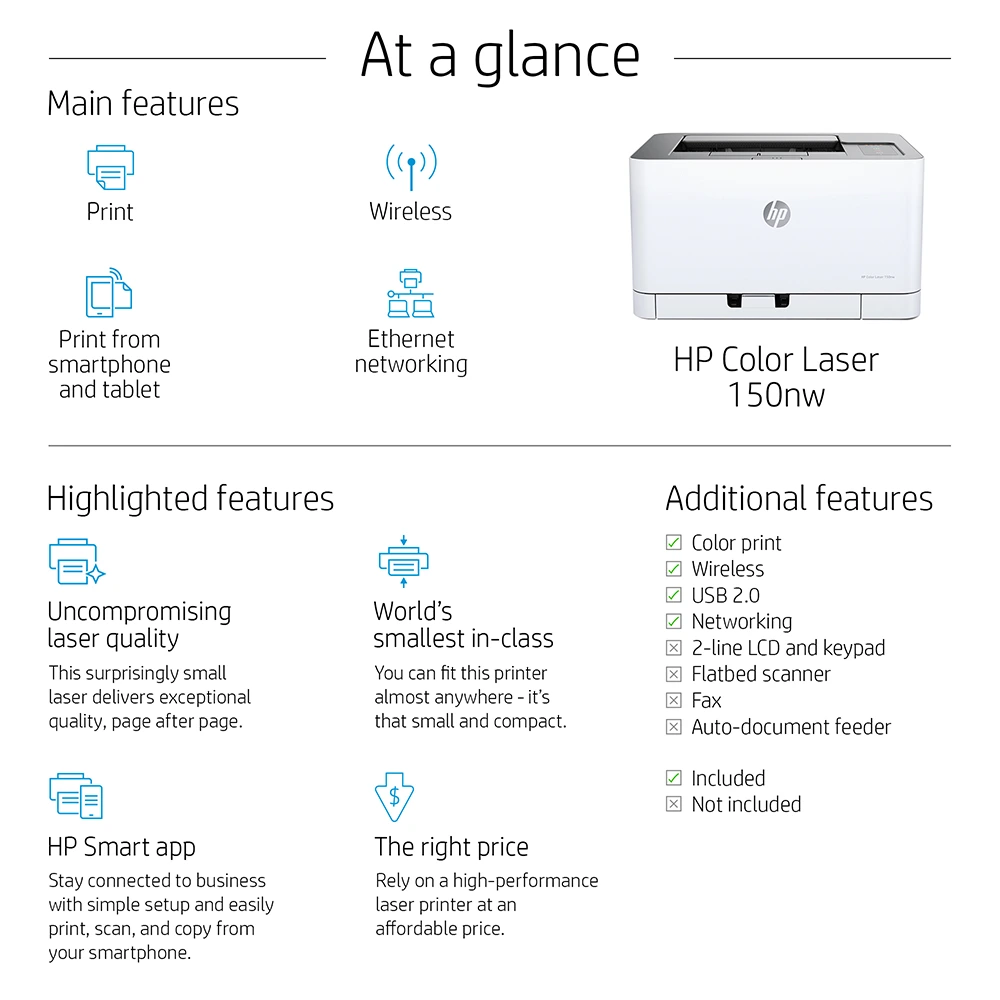 HP Color Laser 150nw (4ZB95A) ek compact, network-ready color laser printer hai jo home offices aur small offices ke liye design ki gayi hai. Yeh printer fast black prints (18–19 ppm) aur basic color prints (4 ppm) provide karta hai, aur manual duplex printing ka support deta hai. Isme built-in Ethernet aur Wi-Fi hai, jisse multiple users ke liye network printing aur mobile printing (Apple AirPrint, Google Cloud Print, Mopria, Wi-Fi Direct) possible hai. Printer energy efficient, CECP aur Blue Angel certified hai, aur low-volume color print requirements ke liye cost-effective solution hai.