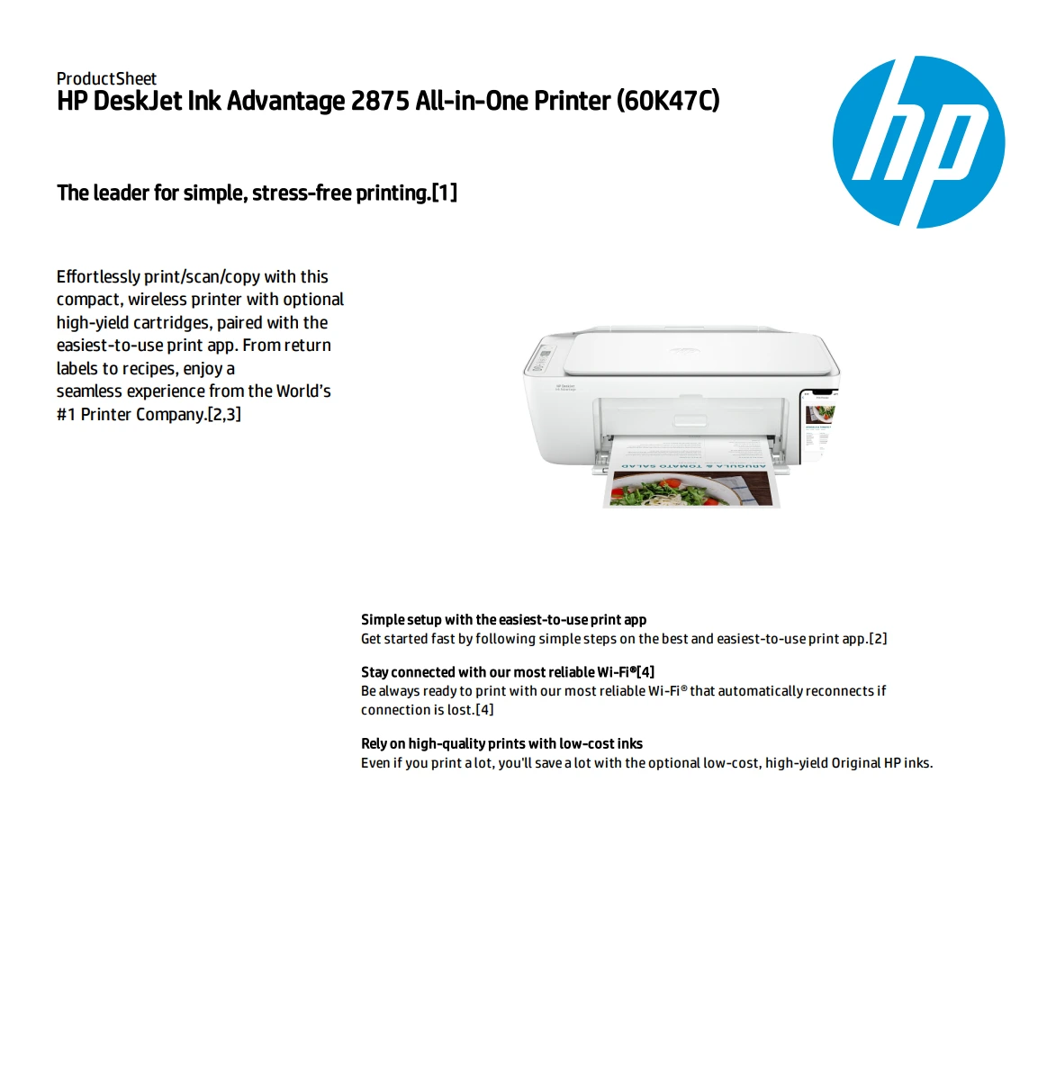 - HP DeskJet Ink Advantage 2875 All-in-One Printer (60K47C) offers print, scan, and copy functions with Wi-Fi connectivity, manual duplex printing, and HP 653 setup cartridges for high-quality, convenient printing at home or office.