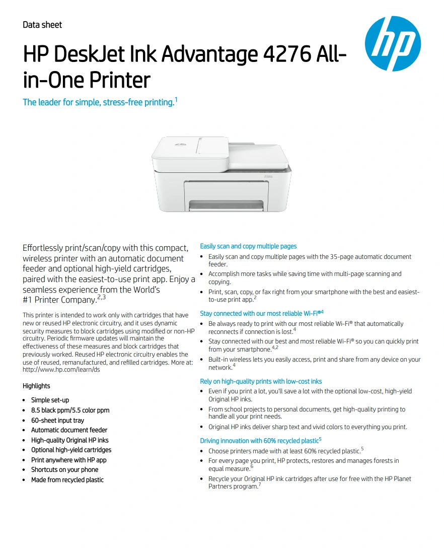 Reviews for - HP DeskJet Ink Advantage 4276 All-in-One Wireless Printer with Icon LCD Display, Flatbed & ADF Scanner, 1 Year Warranty 60K49C