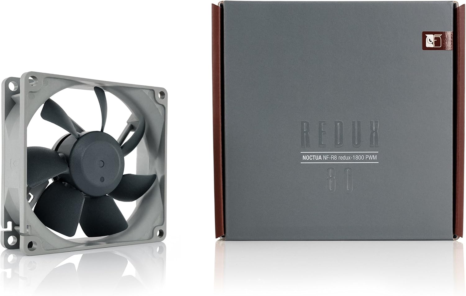 - Noctua NF-R8 redux-1800 PWM 80mm high performance cooling fan with 4-Pin connector, 1800 RPM speed, 12V operation, and compact 8 x 8 x 2.49 cm grey design.