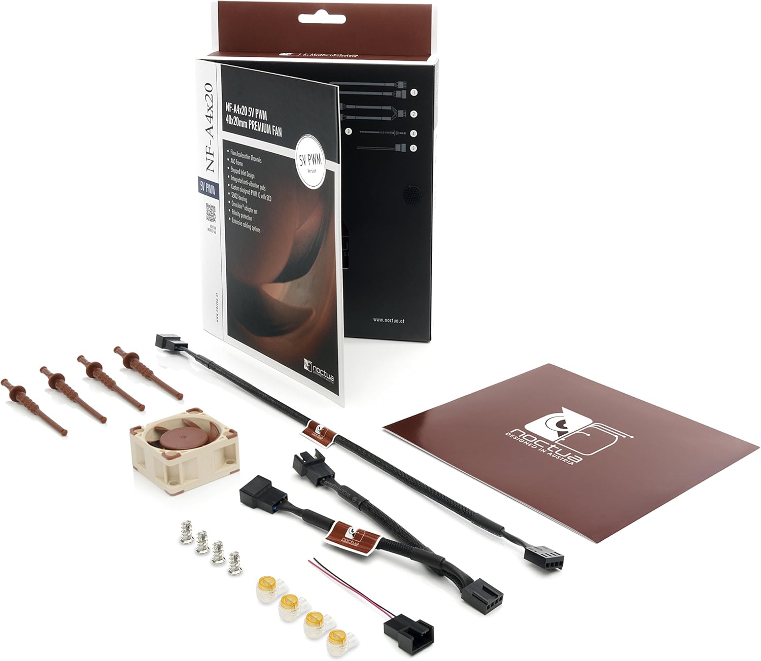 - Compact 40x40x20 mm brown Noctua NF-A4x20 5V PWM PC fan, 91g, 5V voltage, 4-pin PWM connector, ideal for efficient air cooling in small PC builds.