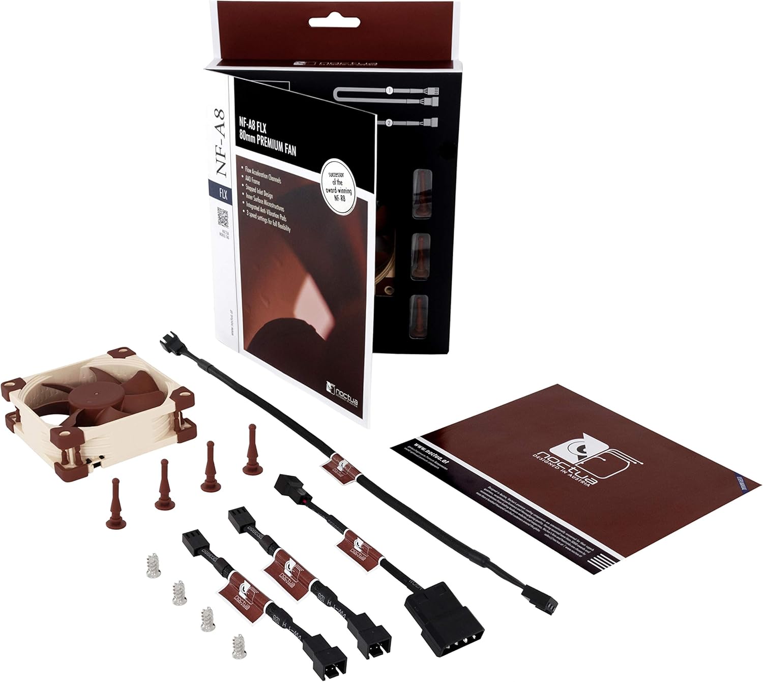 - Noctua NF-A8 FLX is a compact 80mm brown silent fan with a 3-pin connection, 12V operation, and lightweight 222g design, offering quiet and efficient cooling.