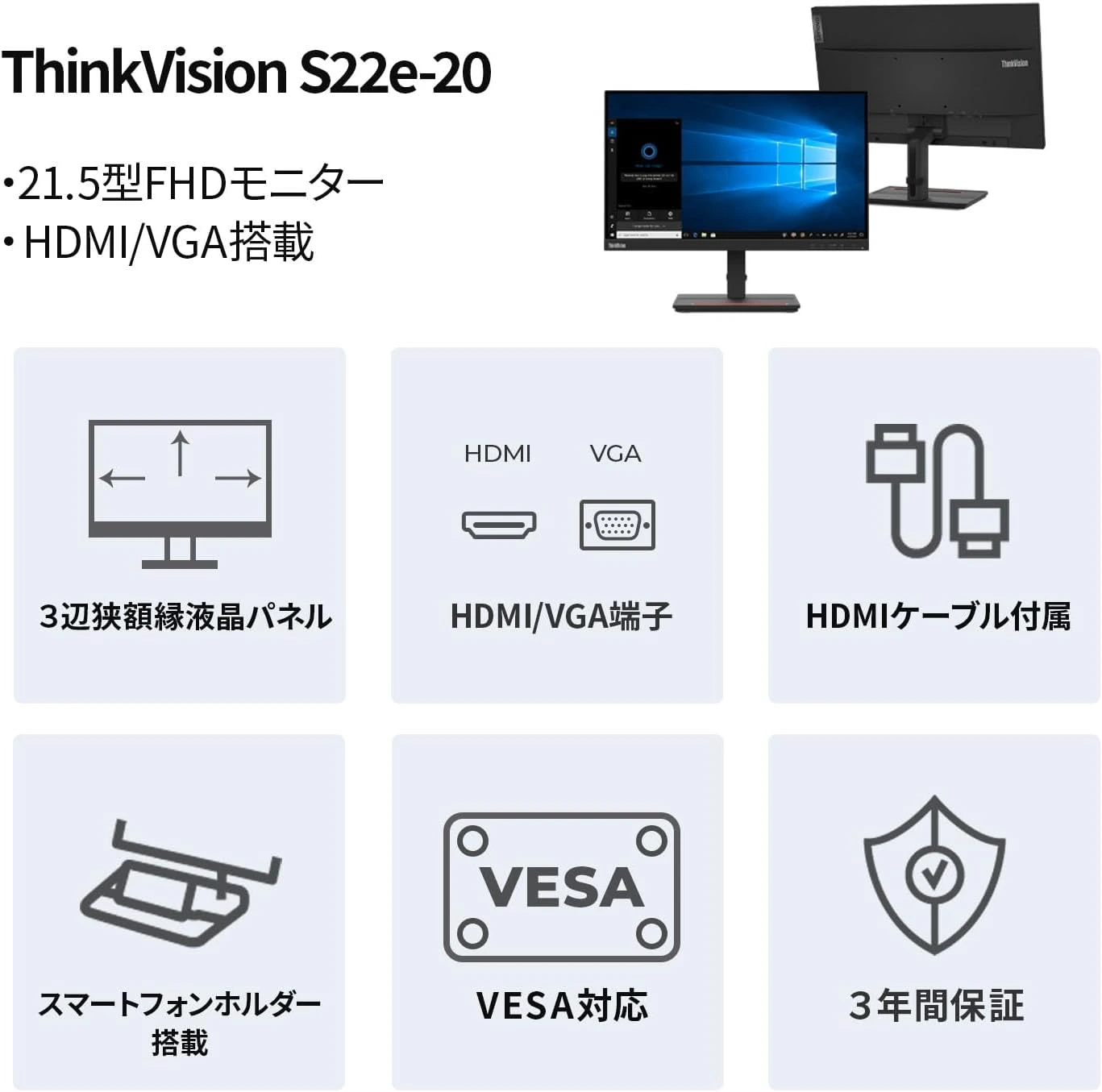 - Lenovo 21.5 Inch FHD VA WLED LCD Monitor with matte surface, full HD 1080p, HDMI & analog input, tilt stand, blue light reduction, and flicker-free display for comfortable and secure daily use.