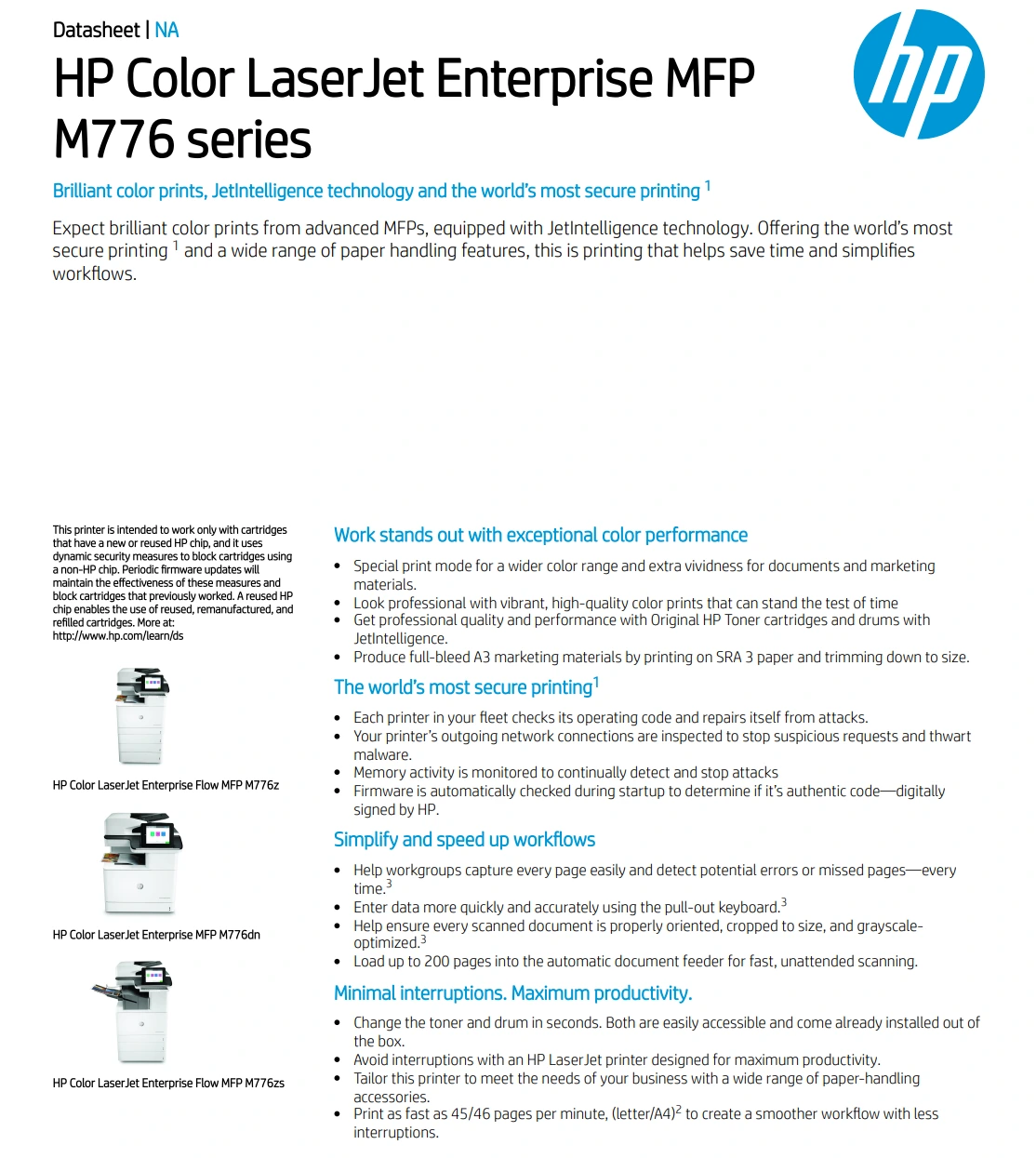 - The HP Color LaserJet Enterprise Flow MFP M776zs (T3U56A) is an enterprise-grade A3 color laser multifunction printer offering fast printing,