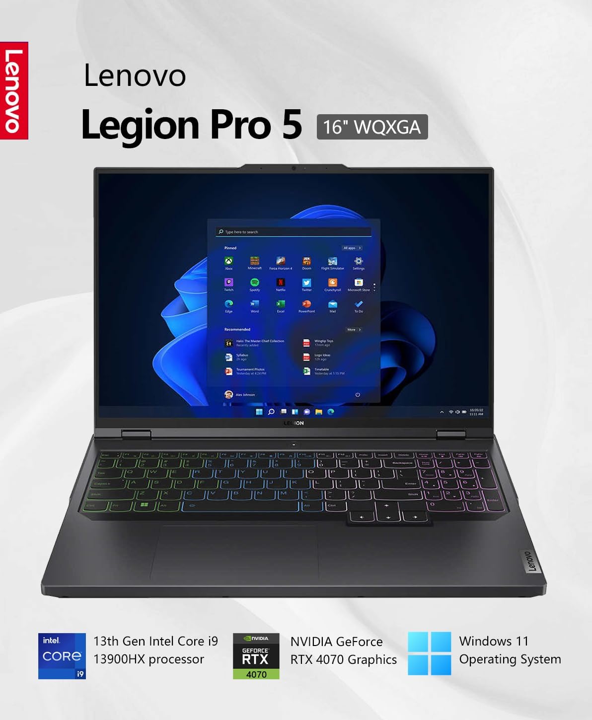 - Lenovo Legion Pro 5 16IRX8 is a high-end gaming laptop featuring a 16" WQXGA+ display, Intel Core i9-13900HX 24-core processor, 16GB DDR5 RAM, 1TB SSD, NVIDIA GeForce RTX 4070 8GB graphics, Windows 11, backlit keyboard, Wi-Fi 6E, and Onyx Grey finish for immersive gaming performance.